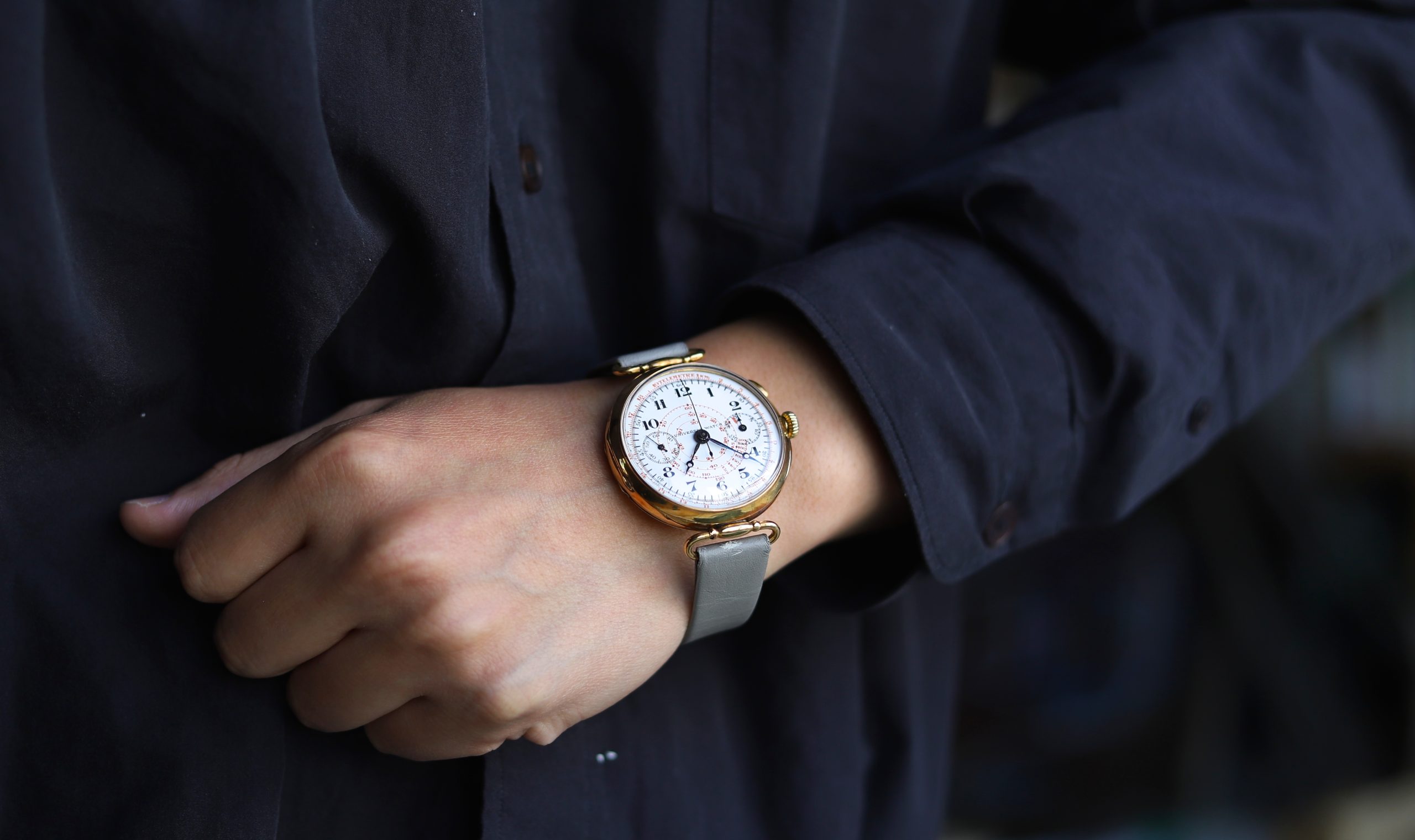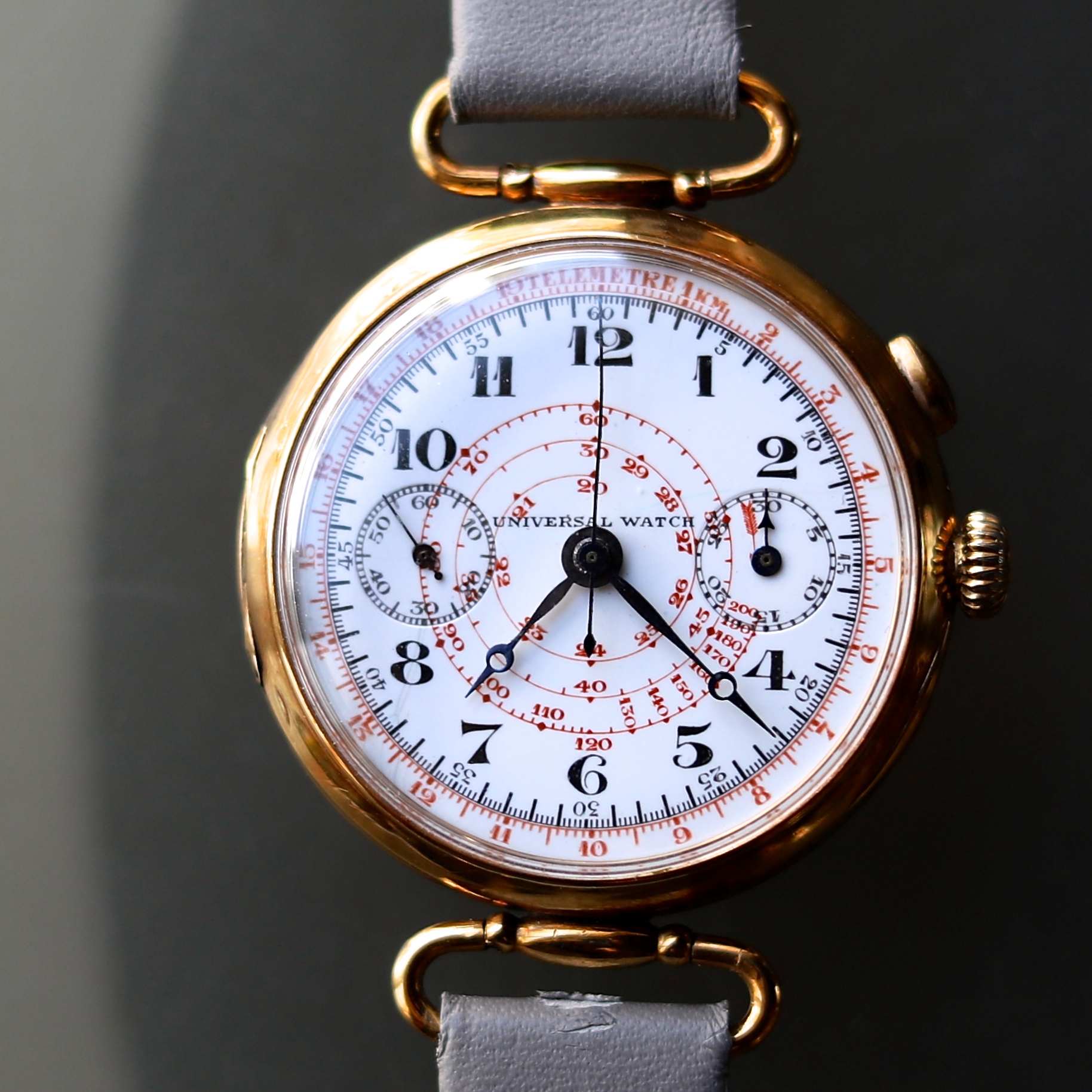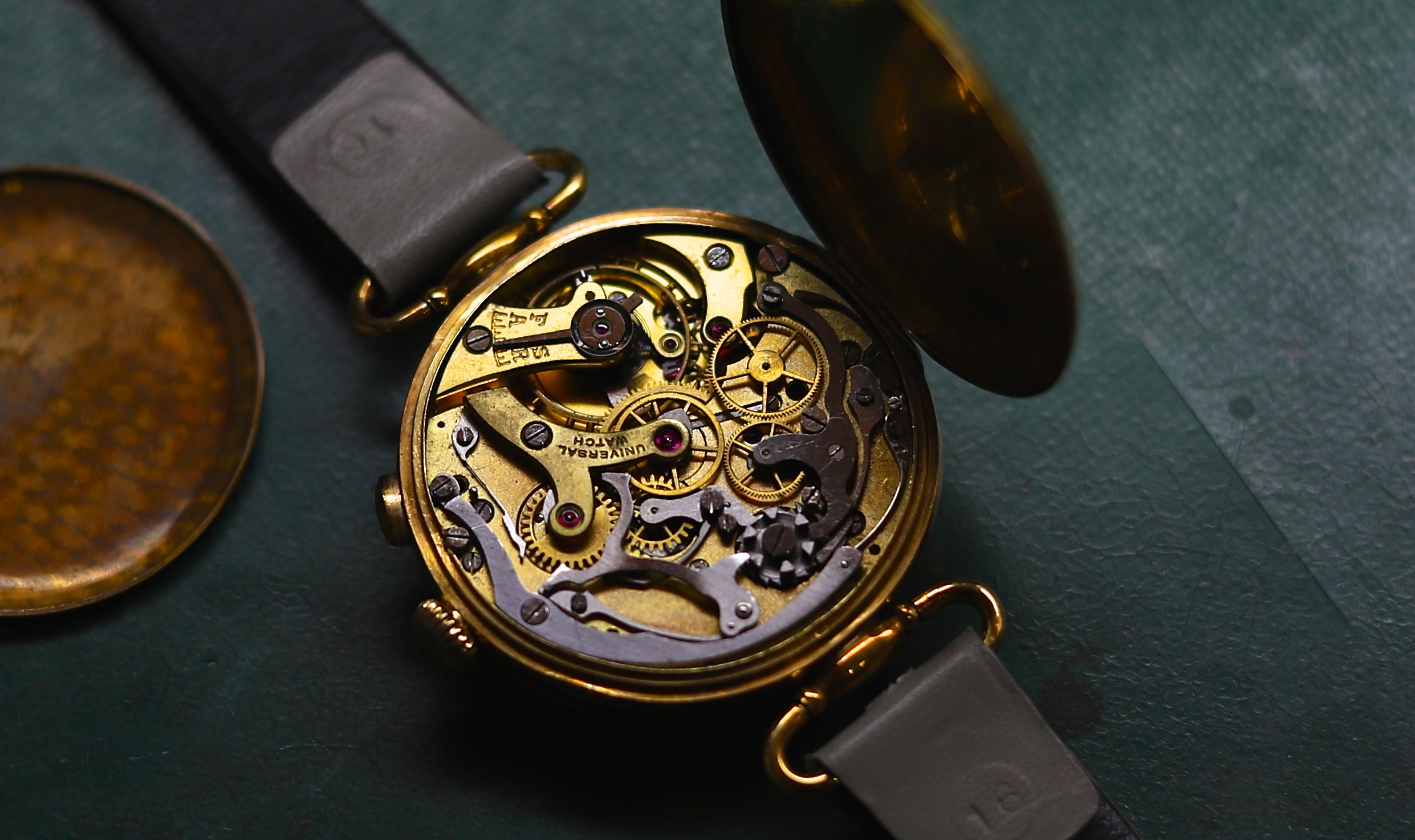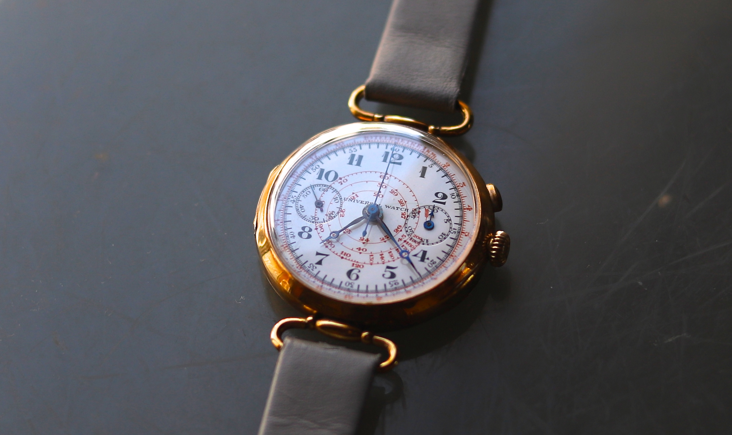 クロノグラフ機構が流通し始めたのは1930年代頃と言われていますが、ユニバーサルは1898年の時点で30分の積算計を備えた時計を発表。