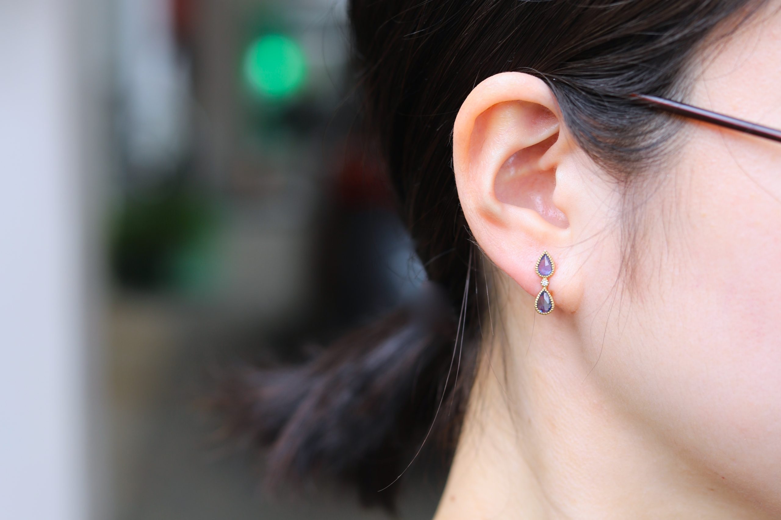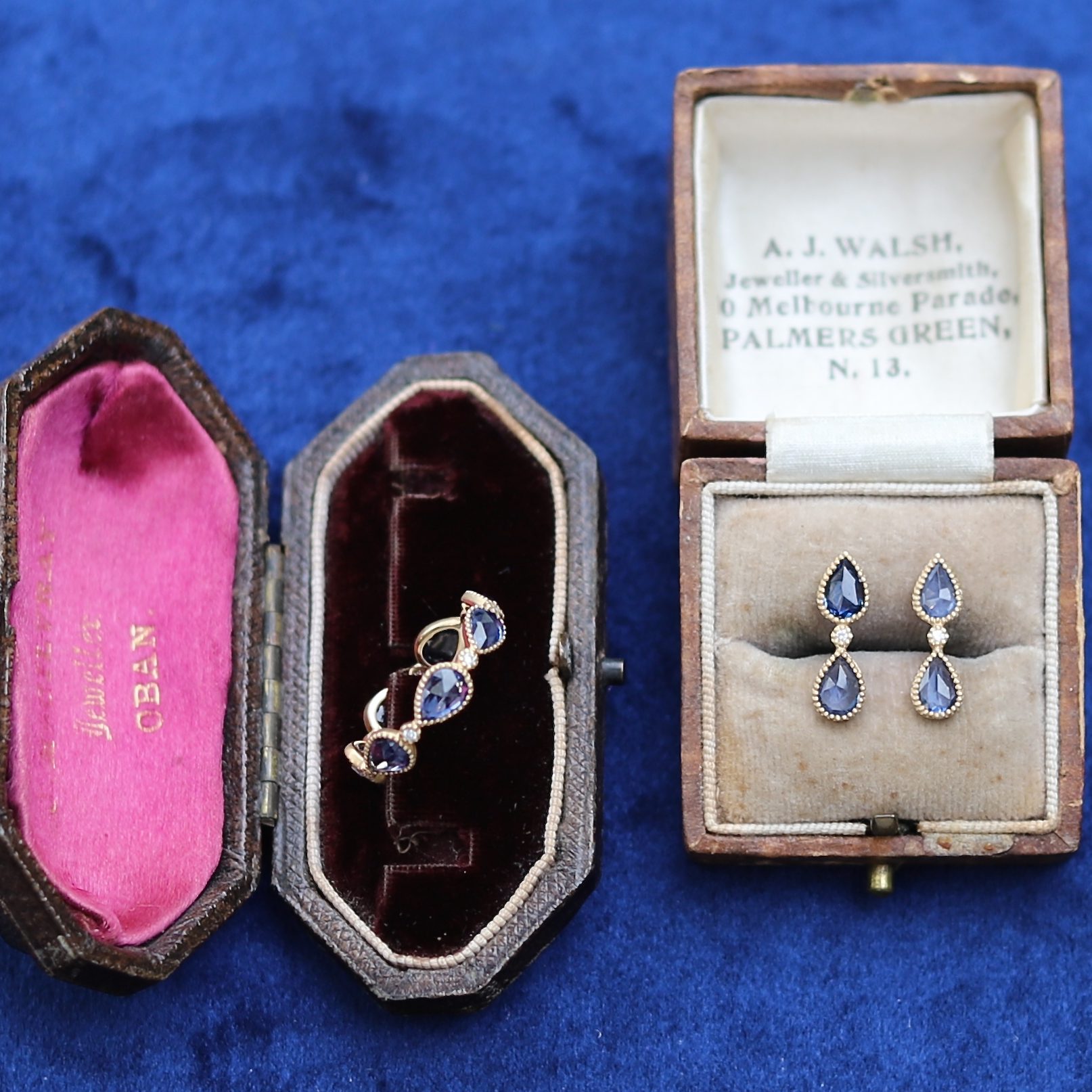 ブルーサファイアとダイヤモンドのリングとピアス。 シックなネイビーブルーカラーとドロップ型のシェイプが エレガントで上品なジュエリーです。