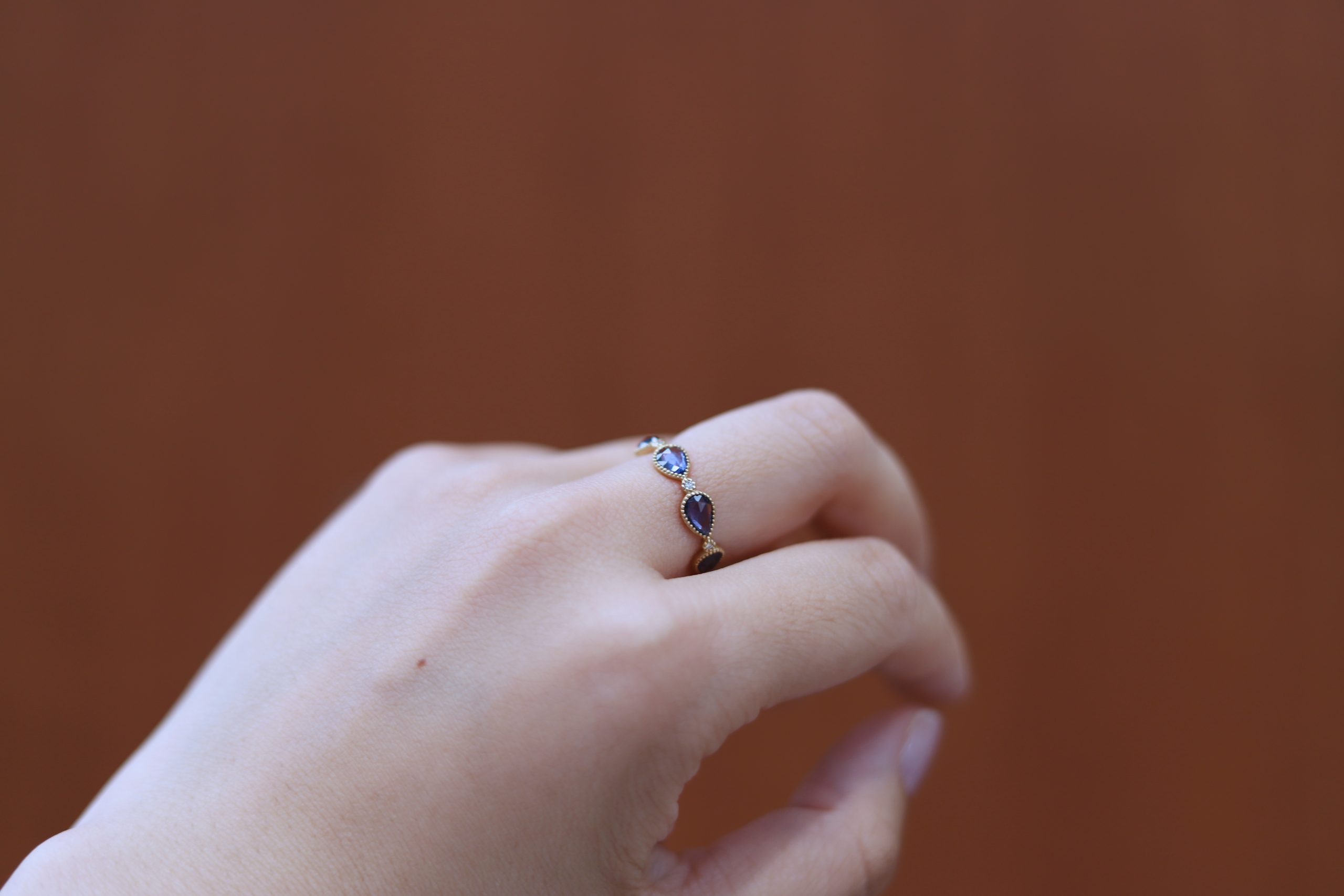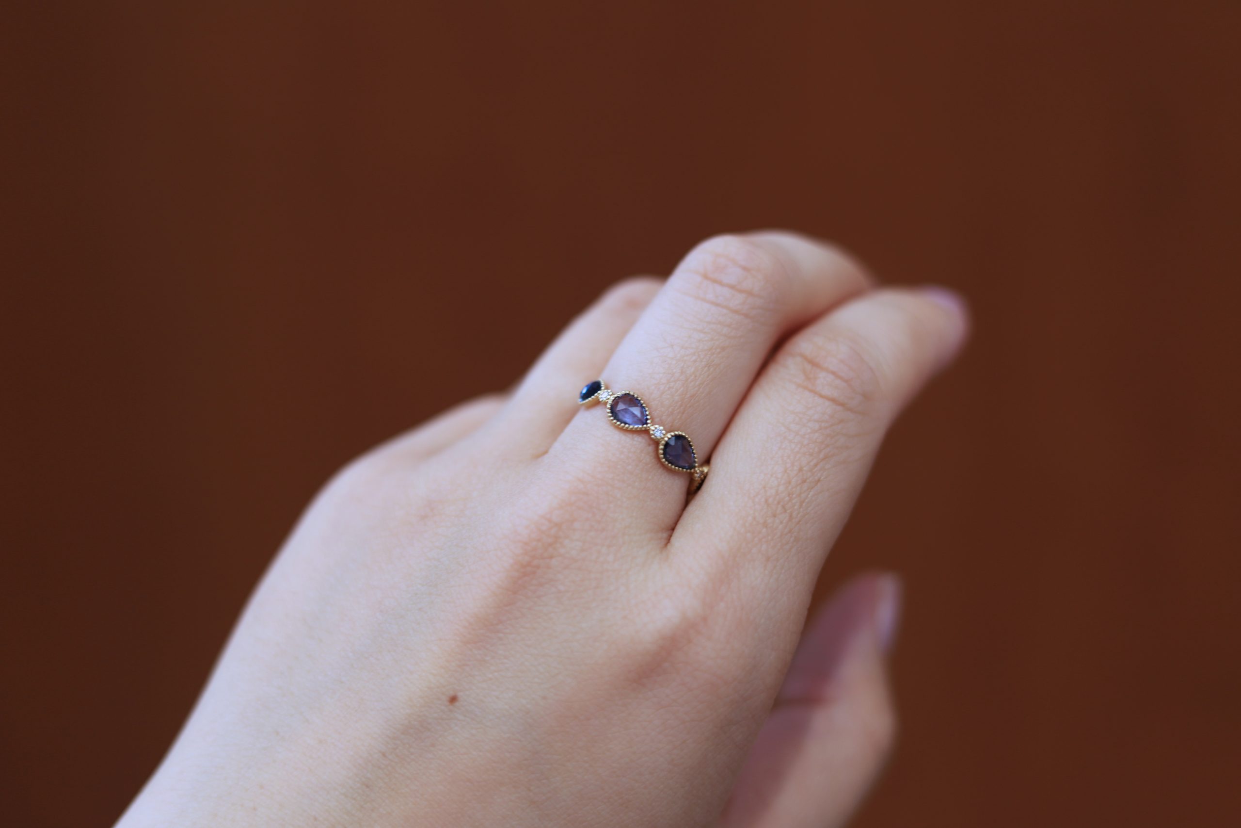 石の周りにはミル打ちを施し、 繊細でクラシカルな雰囲気。 ダイヤモンドが奥行きのあるサファイアの輝きを 一層引き立てています。